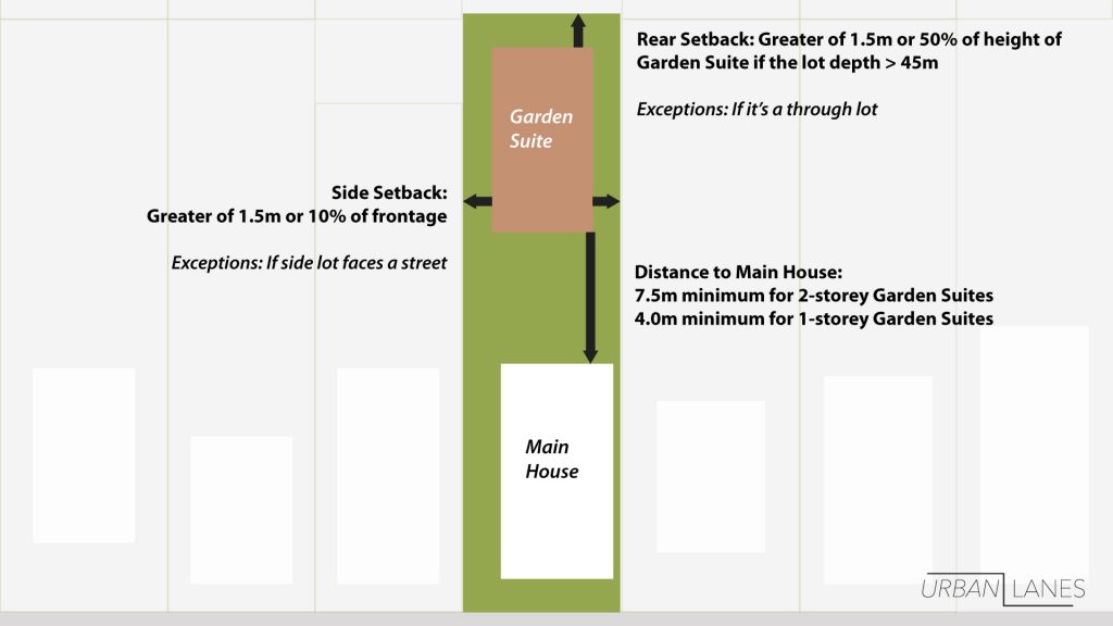 The setback requirements for a Garden Suite are stricter than those for a Laneway Suite, which means that a Garden Suite may not be feasible if your lot is too narrow or short, even if a Laneway Suite is possible.