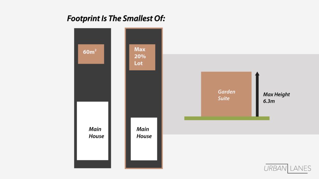 Compared to laneway suites, garden suites come with tighter size limits. The footprint on the main floor is capped at the smaller of: