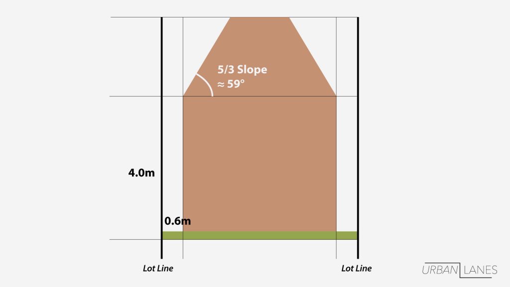 But if the side wall is closer than 1.5 metres from your minimum required setback, then you’ll need a gentle slope on that side of the roof, with a max angle of 5 vertical to 3 horizontal. This rule only applies to the sides and is meant to reduce the impact on neighbours.